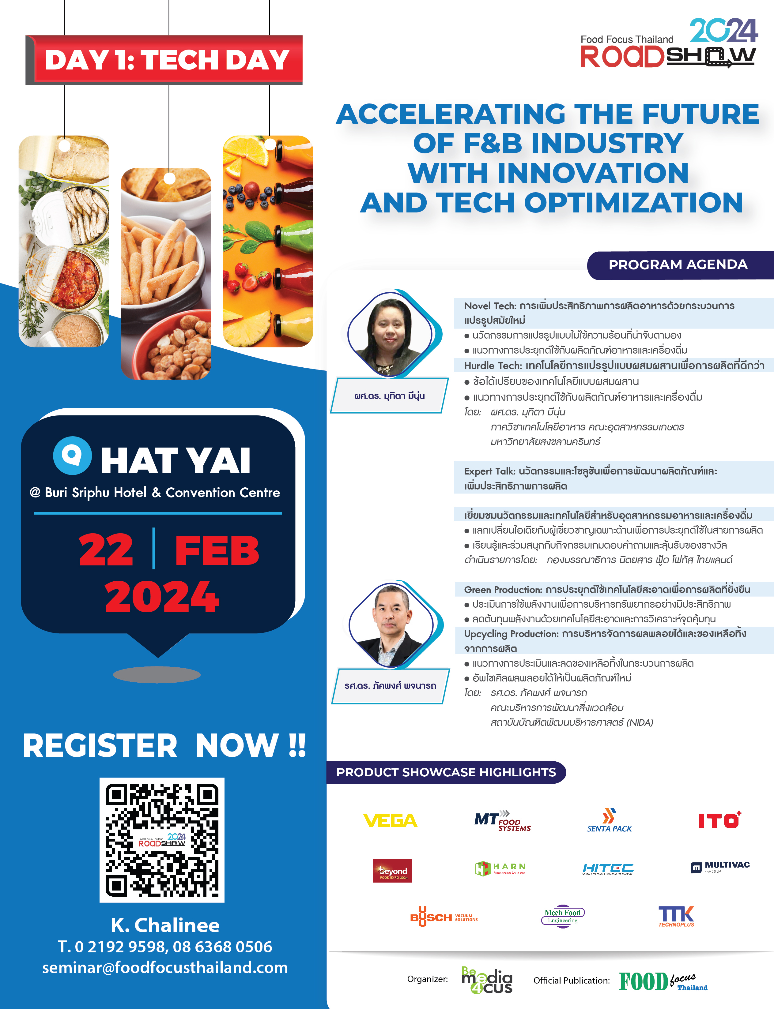 มาร่วมเปิดประสบการณ์ในหัวข้อ Novel Tech: การเพิ่มประสิทธิภาพการผลิตอาหารด้วยกระบวนการแปรรูปสมัยใหม่ และHurdle Tech: เทคโนโลยีการแปรรูปแบบผสมผสานเพื่อการผลิตที่ดีกว่า พร้อมพบกับตัวอย่างของเทคโนโลยีที่น่าสนใจอันมีส่วนสนับสนุนให้อาหารมีมูลค่าสูงและลดต้นทุนในกระบวนการผลิตอย่างยั่งยืนด้วย Green Production: การประยุกต์ใช้เทคโนโลยีสะอาดเพื่อการผลิตที่ยั่งยืน และUpcycling Production: การบริหารจัดการผลพลอยได้และของเหลือทิ้งจากการผลิต