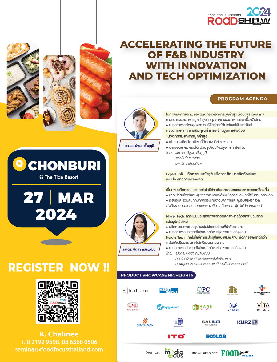 Food Focus Thailand Roadshow 2024 พร้อมเป็นส่วนหนึ่งในการร่วมผลักดันอุตสาหกรรมอาหารของไทยให้ก้าวสู่การเป็นศูนย์กลางผลิตและส่งออกอาหารระดับภูมิภาค (Regional Food HUB) พร้อมสนับสนุนให้อุตสาหกรรมอาหารและเครื่องดื่มของไทยเติบโตอย่างมั่นคงพร้อมรับมือวิกฤตอาหารโลก กับการจัดงานสัมมนาในธีม “ACCELERATING THE FUTURE OF F&B INDUSTRY WITH INNOVATION AND TECH OPTIMIZATION” ขับเคลื่อนอนาคตอุตสาหกรรมอาหารและเครื่องดื่มด้วยนวัตกรรมและเทคโนโลยี