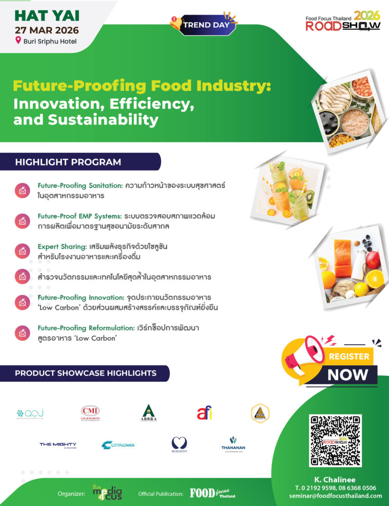 ร่วมเป็นส่วนหนึ่งของการเดินทางสู่ปีที่ 9 กับ FOOD FOCUS THAILAND ROADSHOW 2026 แพลตฟอร์มที่มุ่งยกระดับและขับเคลื่อนอุตสาหกรรมอาหารและเครื่องดื่มของไทยสู่การแข่งขันในระดับโลก เปิดโอกาสให้ผู้ประกอบการได้เข้าถึงนวัตกรรมและเทคโนโลยีที่ล้ำสมัย พร้อมรับฟังความรู้เชิงลึกจากผู้เชี่ยวชาญตัวจริงในแต่ละสาขา สร้างเครือข่ายธุรกิจกับพันธมิตรและคู่ค้าที่แข็งแกร่ง เพื่อพัฒนาผลิตภัณฑ์ที่ตอบโจทย์ ยกระดับกระบวนการผลิตให้มีประสิทธิภาพ บนพื้นฐานความปลอดภัยและเป็นมิตรกับสิ่งแวดล้อมร่วมผลักดันอุตสาหกรรมอาหารไทยให้เป็นศูนย์กลางการผลิตและส่งออกอาหารระดับภูมิภาคด้วยนวัตกรรมและความยั่งยืน พร้อมโอกาสในการสร้างการรับรู้แบรนด์ ขยายฐานลูกค้าเป้าหมาย และครองส่วนแบ่งการตลาดในอุตสาหกรรมอาหารและเครื่องดื่มที่เติบโตอย่างต่อเนื่อง Future-Proofing Food Industry: Innovation, Efficiency, and Sustainabilityท่ามกลางความเปลี่ยนแปลงของโลกที่เกิดขึ้นอย่างต่อเนื่อง ทั้งด้านเศรษฐกิจ สิ่งแวดล้อม และเทคโนโลยี ทำให้อุตสาหกรรมอาหารและเครื่องดื่มกำลังเผชิญกับความท้าทายรอบด้าน ตั้งแต่การจัดหาวัตถุดิบ การผลิต การบริหารห่วงโซ่อุปทาน ไปจนถึงการตอบสนองต่อความต้องการของผู้บริโภคยุคใหม่ที่ให้ความสำคัญกับสุขภาพ ความปลอดภัย และความยั่งยืนมากยิ่งขึ้น การปรับตัวให้ทันต่อกระแสโลกในขณะที่ยังคงรักษาความสามารถในการแข่งขัน จึงกลายเป็นภารกิจสำคัญของผู้ประกอบการในยุคนี้ภายใต้แนวคิด Future-Proofing Food Industry: Innovation, Efficiency, and Sustainability จึงมุ่งเน้นไปที่การเสริมสร้างศักยภาพของอุตสาหกรรมอาหารไทยให้พร้อมรับมือกับอนาคตอย่างมั่นคง ด้วยการนำ นวัตกรรม มาเป็นกลไกหลักในการยกระดับกระบวนการผลิต เพิ่ม ประสิทธิภาพ เพื่อให้เกิดความคุ้มค่าและลดผลกระทบต่อสิ่งแวดล้อม ที่พร้อมขับเคลื่อนองค์กรสู่ ความยั่งยืน ในทุกมิติ ทั้งด้านเศรษฐกิจ สังคม และสิ่งแวดล้อม