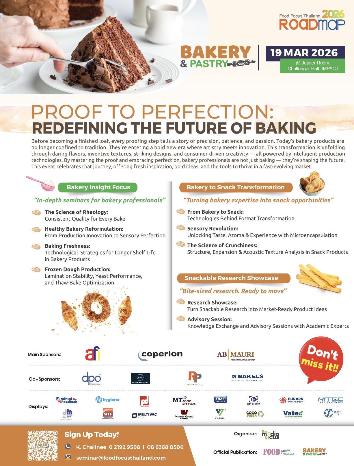 Proof to Perfection: Redefining the Future of Bakingกว่าจะได้ขนมปังแต่ละก้อน ทุกขั้นตอนล้วนสะท้อนถึงเรื่องราว ความพิถีพิถัน และความหลงใหลในศาสตร์แห่งการอบ ผลิตภัณฑ์เบเกอรีในวันนี้ไม่ได้หยุดอยู่แค่สูตรดั้งเดิมอีกต่อไป แต่กำลังก้าวเข้าสู่ยุคใหม่ที่ศิลปะและนวัตกรรมหลอมรวมกันอย่างสมบูรณ์แบบ ผ่านความแปลกใหม่ด้านกลิ่นรส การปฏิวัติด้านเนื้อสัมผัส รูปลักษณ์ที่ดึงดูด การสร้างสรรค์ที่ใส่ใจผู้บริโภค และเทคโนโลยีการผลิตที่ล้ำสมัย ความพิถีพิถันในทุกขั้นตอนคือ หัวใจสำคัญในการขับเคลื่อนอนาคตของอุตสาหกรรมเบเกอรี ร่วมสร้างแรงบันดาลใจ ค้นหาไอเดีย พร้อมนิยามแห่งความสำเร็จครั้งใหม่ไปกับเรา