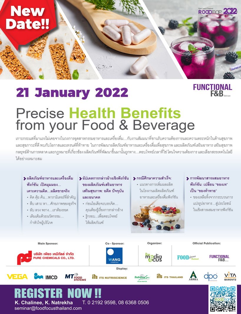 เกาะกระแสที่มาแรงไม่เคยจางในวงการอุตสาหกรรมอาหารและเครื่องดื่ม…กับงานสัมมนาที่ขานรับความต้องการและความตระหนักในด้านสุขภาพและสุขภาวะที่ดี พบกับโอกาสและเทรนด์ที่ท้าทายในการพัฒนาผลิตภัณฑ์อาหารและเครื่องดื่มเพื่อสุขภาพ และผลิตภัณฑ์เสริมอาหาร เสริมสุขภาพ กลยุทธ์ด้านการตลาด และกฎหมายที่เกี่ยวข้อง ผลิตภัณฑ์ที่พัฒนาขึ้นมานั้นถูกทาง…ตอบโจทย์เวลาที่ใช่ โดนใจความต้องการ และเลือกสรรเทคโนโลยีได้อย่างเหมาะสม