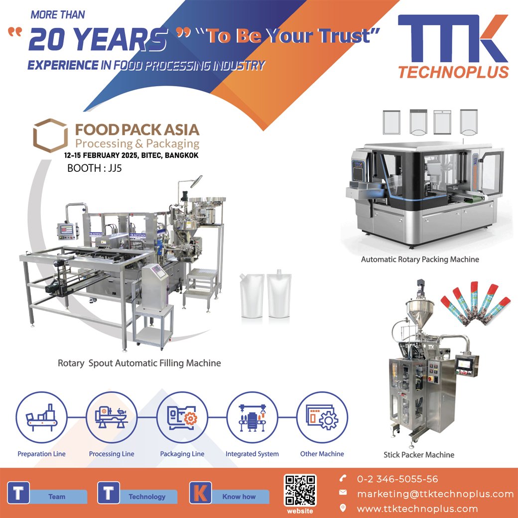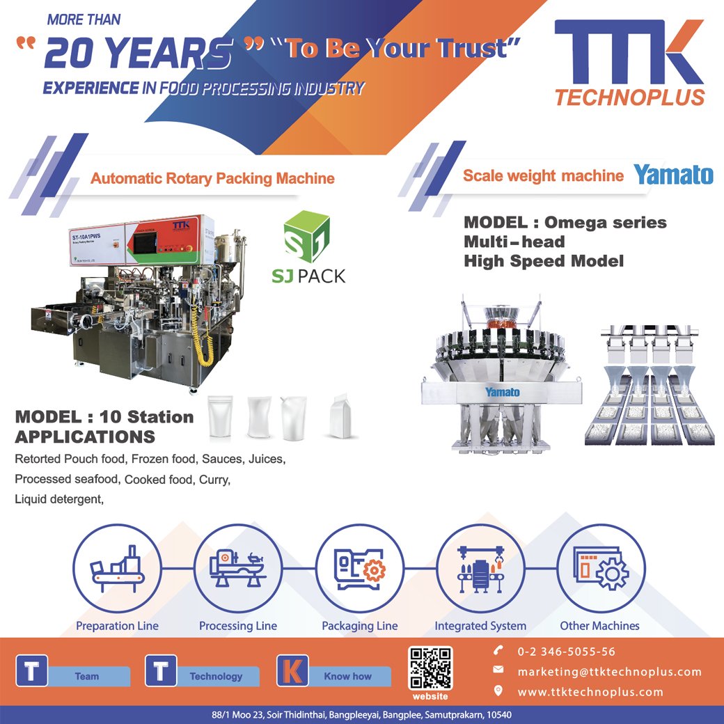 TTK Technoplus Co., Ltd. is a leader in food packaging machinery and processing technology. With more than 20 years of experience. TTK Techoplus has a reliable partner for businesses both local and abroad. TTK has made continuous efforts in Providing unique and innovative manufacturing technology solutions to FMCG businesses. One-stop solutions you can rely on.