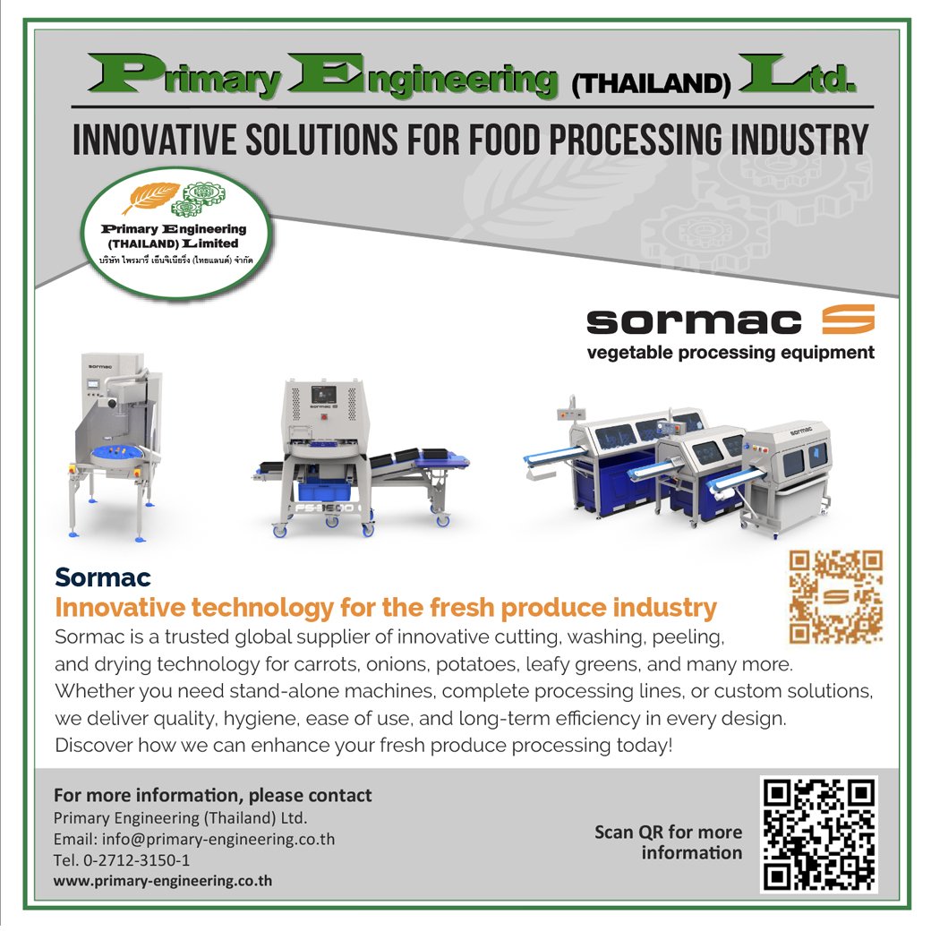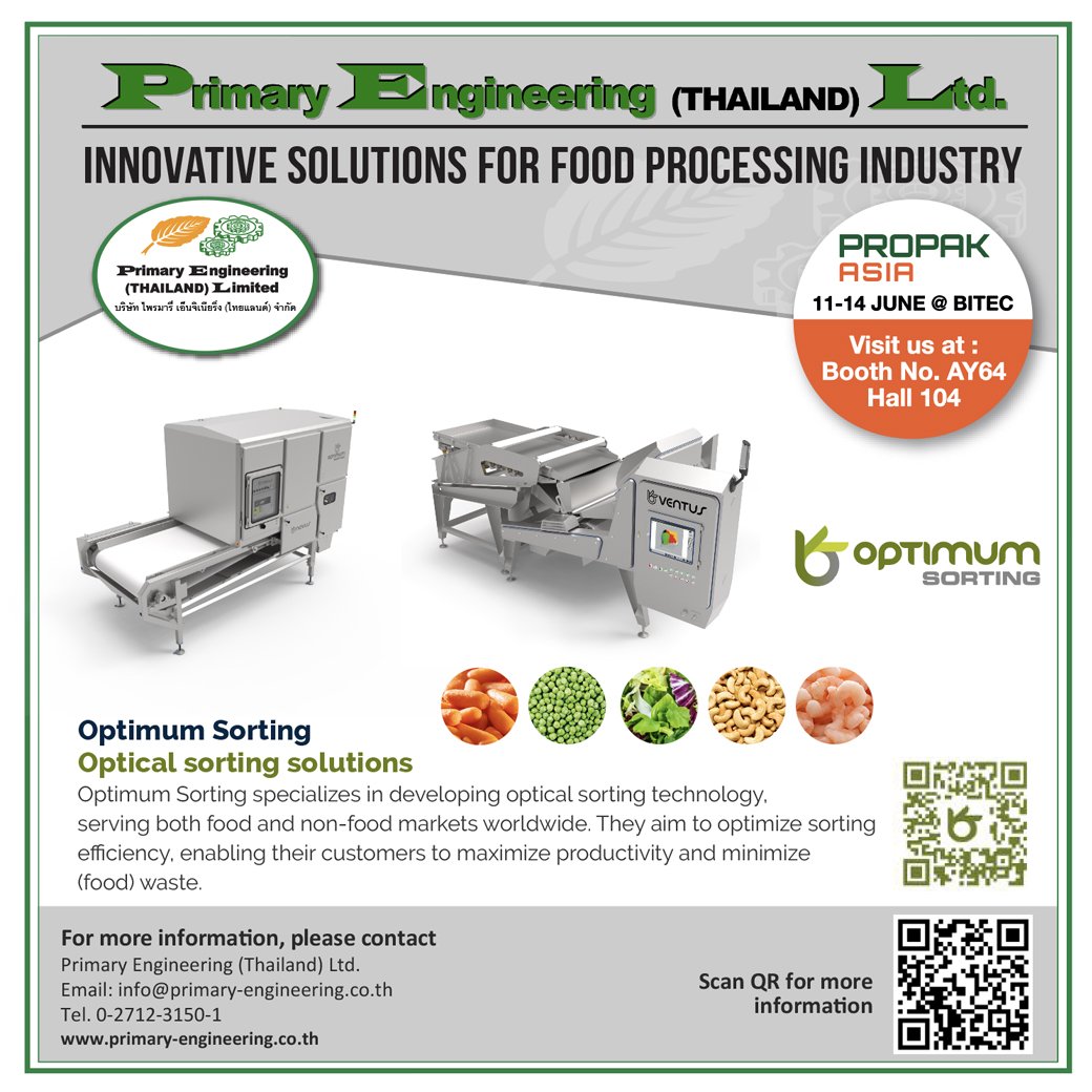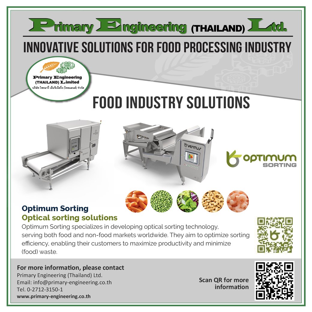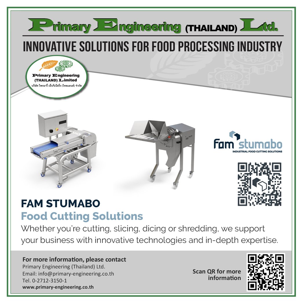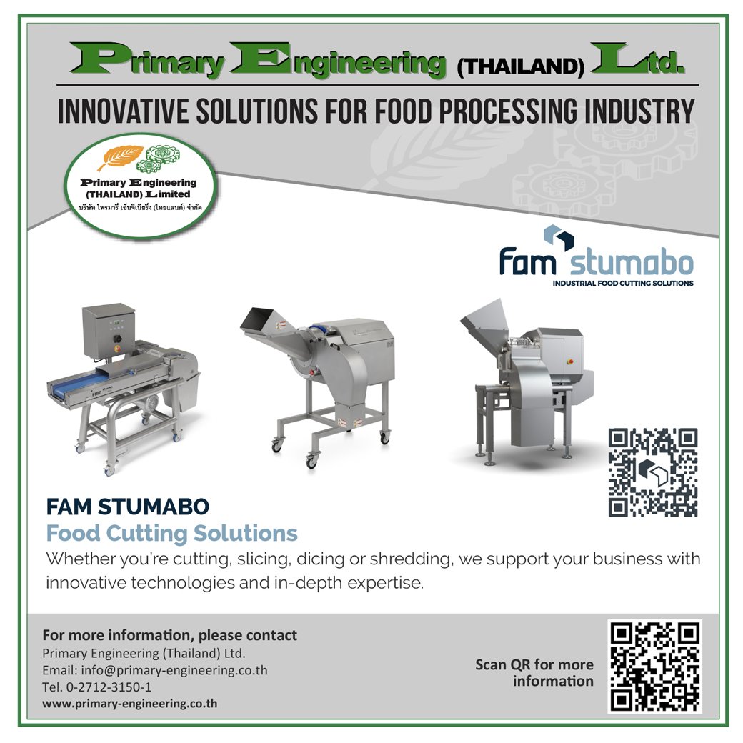 Primary Engineering (Thailand) Ltd. provides machines and services to the food processing industries. As well as being the official representative of Tomra Sorting Solutions for sorting machines and FAM Cutting Solutions for food cutting machines. We supply Automation and Process Equipment for the complete industry, including but not limited to: vegetables, fruits, potatoes, cheese, nuts, seeds, meat and seafood. The company’s mission is to enable its customers to improve returns, gain operational efficiencies, and ensure a safe food supply via smart and sustainable technologies.